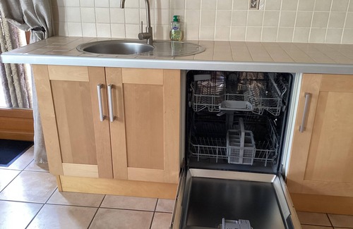 The dining and kitchen area is spacious and well equipped with modern Bosch appliances including dishwasher and integrated fridge with small freezer compartment. Coffee machines including Dolce Gusto