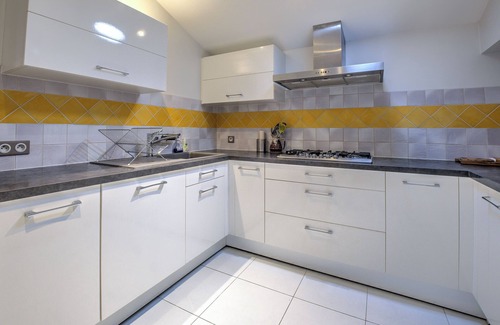 Equipped kitchen: dishwasher, oven, microwave, 5-burner stove, fridge freezer.