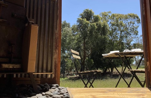 A comfortable off-grid accommodation with a queen-sized bed in the loft, a couch on the ground floor, and all the modern amenities you need. All with a well-stocked kitchenette with cooking tools and cutlery, a portable electric cooler fridge, and a toasty pot-bellied stove to keep your bellies warm.