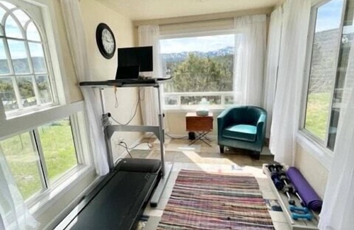 The exercise room is in a pod outside. It has a 180 degree windows which makes for a really great workout! Please be aware it is not attached to the home. Winter time it may be harder to heat, and you will have to trek through snow. The treadmill is a walking desk and only goes up to 4mph.
