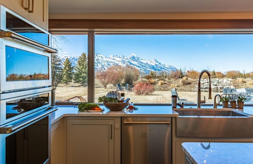 This newly remodeled, mountain modern retreat comfortably accommodates 14 guests in beds between the main house with 4 bedrooms, and the detached 2 bedroom guest house, and up to 18 guests with sleeper sofas in each. As you make your way through the sprawling one level main house, the Grand Tetons are on full display throughout – from the over-the-top, gourmet chef's kitchen with Gaggenau appliances, breakfast nook with seating for four, outdoor deck living area with BBQ grill for dining al fresco, large and cozy living room with picture windows for maximum viewing & a striking stone gas fireplace, an office, and finally, the incredible master suite that redefines Teton dreaming! Enjoy dramatic views from the king bed, your own private living area with HDTV and a gas fireplace, or while relaxing in the soaking tub of your spa-like master bathroom, and find inspiration while catching up on emails from your own workspace, training on the Peloton, or enjoying your morning coffee from your back patio area as the rising sun reflects off the mountain peaks!