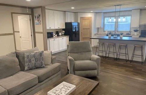 Featuring a king master suite with a private full bathroom. A spacious great room perfect for family gatherings that includes a 50" television with app access to connect to all your streaming needs (subscriptions are not included. You will need to connect to your own accounts). Just through hallway you will find 4 additional queen bedrooms (one featuring double queens), two full bathrooms and a laundry room with a brand new high efficiency washer and dryer. The full kitchen comes complete with a refrigerator with ice maker, stove, oven, microwave, dishwasher, coffee maker (grounds, powder creamer, filters and sugar included), toaster, blender, dishes, and cookware. Covered front deck with chairs giving guests the perfect spot to relax rain or shine. Cook up a outdoor meal on the back deck featuring a 5-burner grill (gas included), table and chairs.