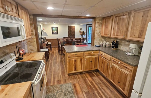 The kitchen is ready for family meals or lazy breakfasts: full-size fridge, stove, oven, dishwasher, microwave, drip coffee + Keurig, cookware, glassware, and more. The handcrafted cherry table seats 8, plus bar seating for two.