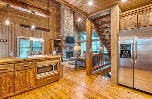 As you step into this lodge you'll find all the luxuries of fine living as you & your guests spread out in the open and spacious family room. Kickback and enjoy the stack-stone fireplace with a flat screen TV conveniently hanging above for your entertainment.
