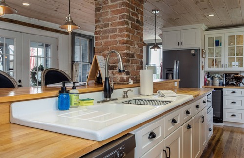 We did away with 3 small rooms on the first level and added a large modern kitchen and living area. The bar that seats 5 was made of reclaimed wood from the property except the new butcher block top. There is also farm table with seating for 6 which was my mom and dad’s table where they hosted many Sunday dinners. Since we also make this our home from time to time it is well equipped with everything you need for preparing meals. The appliances are new and the range is gas. The sink is from the 1940's and it does feature a garbage disposal and there is a dishwasher.