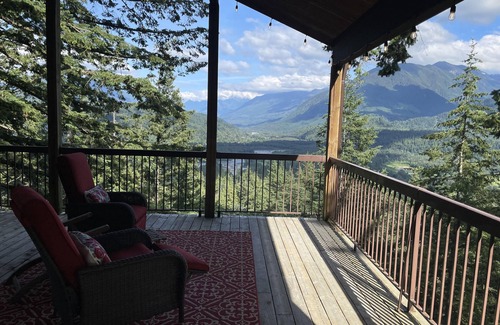 Escape to to this majestic mountaintop retreat with panoramic views of Cultus Lake and Vedder River. Unwind and destress enjoying one of the enormous decks where you can lounge on swinging beds, while watching the eagles soar. There is plenty of room to practice yoga, then you can finish your day off with a soak in our indoor hot tub with doors open to take in the vistas.