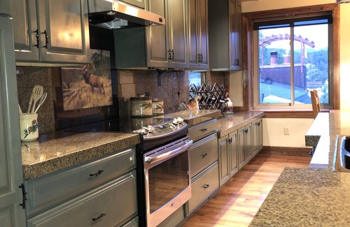 Make yourself at home in the open concept living area, marked by high wood beam ceilings and vintage ski memorabilia. Prop your feet up in front of the gas fireplace while you catch up on your favorite shows or sports on the Smart/cable TV. If TV’s not your thing, there is free WiFi, books, games and the hot tub is right downstairs.
