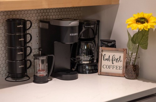 Complete with a kitchenette including a refrigerator, microwave with convection oven, stove, coffee maker, dishwasher, utensils, and dishes.