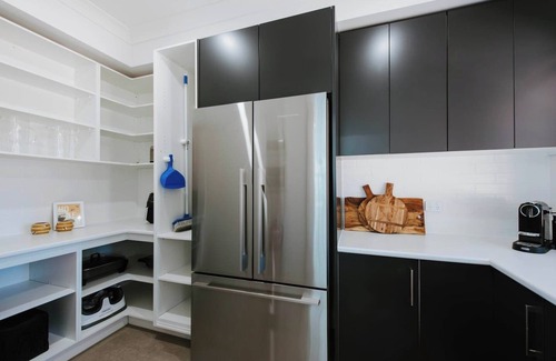 Inside, there’s plenty of room to relax. Kick back on the lounge enjoying the wall-mounted TV and getting cosy in front of the electric fireplace. The fully equipped kitchen makes it easy to prepare meals at home with sleek appliances and modern utensils. It comes with a butler’s pantry and breakfast bar for slow mornings at home. There’s plenty to keep families entertained including a games room with a table tennis table.