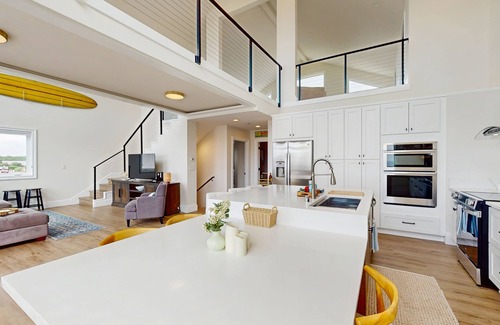 Upstairs, a cozy reading nook with oversized windows lets you sink into a book while the ocean serves as your backdrop. A spacious bonus room—complete with plush seating and four twin beds—is perfect for kids or game nights.