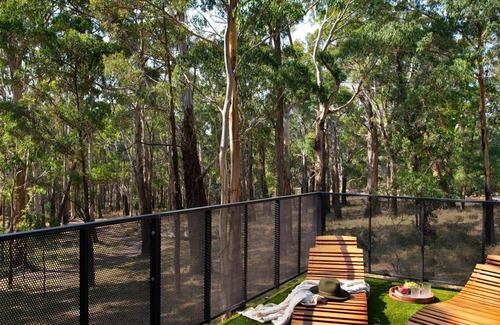 Imagine setting off on a nature hike, surrounded by the Australian wildlife (koalas, wombats, wallabies, kangaroos, cockatoos, and kookaburras can all be seen here)! Or perhaps you prefer to recline on the turfed rooftop sun lounges, losing yourself in a good book while soaking in breathtaking 360-degree views of the treetops. As evening falls, the magic continues in privacy. Whip up a culinary masterpiece in the well-equipped kitchenette, savouring every moment of your intimate meal indoors or al fresco. Then, indulge in the ultimate relaxation as you sink into the outdoor bath, serenaded by crackling flames, and illuminated by the soft glow of festoon lights under a star-studded sky. Wifi enabled but no TV, take advantage of this amazing serene location. (The tiny house has a self composting toilet. A Green Loo GL90 environmentally freindly non flushing)