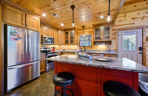 If you like an open floor plan you will love My Best Friend's Cabin! The living room, kitchen and dining area all open to each other. Whether cooking, visiting or watching TV, the family can all be together. The kitchen is fully furnished including a large refrigerator, full size electric range, microwave vent hood and dishwasher. You'll find enough cookware to prepare a meal for your family and friends and more cabinet space than you'll need. The cabin provides dishes, flatware, glasses (including wine glasses) and serving dishes. There is even a gas grill for outdoor cooking. A coffee pot, toaster and blender are also provided. The living room has a large flat screen TV and gas burning fireplace!