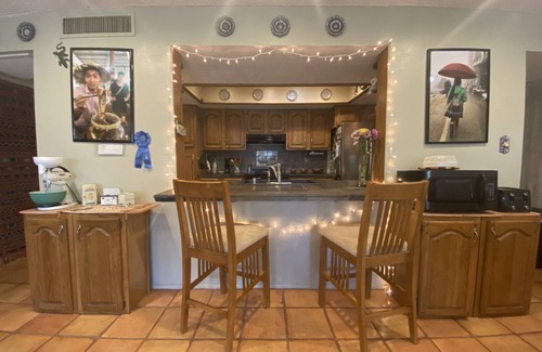 Located in a quiet, safe and attractive neighborhood, this is perfect for both vacation and business travelers. Inside, you'll enjoy comfortable furnishings, fast wi-fi, an Arizona room (enclosed patio) and guest-controlled heat and A/C. Photographs and treasures from international travel decorate the home. Instead of providing a washing machine and dryer, a free 1-day-turn-around complementary laundry service is provided (wash, dry, fold). Outside is a lovely backyard with patio furnishings, song birds and hot tub. (Bathrobes are provided).