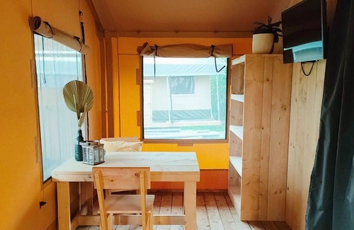 Lodge tent 2 is a spacious glamping tent that is fully equipped for camping. The camping feeling is enhanced by the attractive wooden interior. Lodge tent 2 is suitable for 2 persons and is on the ground floor. The tent can be entered via a few steps. In the living room you will find a nice dining area and an open kitchen with, among other things, a filter coffee maker and refrigerator. The bedroom has a double bed and the bathroom has a shower, toilet and sink. Outside you can enjoy a veranda with garden furniture. At Lodge tent 2 you can park 1 car and you can use the free Wi-Fi connection.
