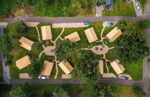 Glamping tent 6 is a spacious, furnished tent that is equipped with all the conveniences while camping. The glamping tent can be entered via a few steps. In the living area you will find a dining area and a modern, open kitchen with a fridge, induction stove and a filter coffee machine. Glamping tent 6 has 3 bedrooms, 2 of which are on the first floor and 1 on the sleeping loft, which can be reached via a ladder. 2 bedrooms have double beds and 1 bedroom has 2 single beds. The bathroom has a shower, toilet and sink. You can park 1 car at the glamping tent and you have free Wi-Fi at your disposal.