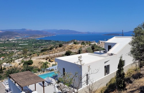 Striking modern villa, close to Nafplio, with beautiful panoramic sea and mountain views.