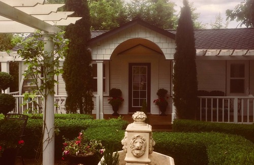 View is looking out into large enclosed gardens, pergola with gorgeous fountain. This is a guest cottage set on impeccable manicured grounds of a historic manor house! A 5 minute car ride to downtown Kirkland and 20 minutes to downtown Seattle. Every amenity within minutes of this beautiful cottage with park-like surroundings. The cottage sits on one acre of enclosed gardens where right outside you have your own patio with pergola and fountain!