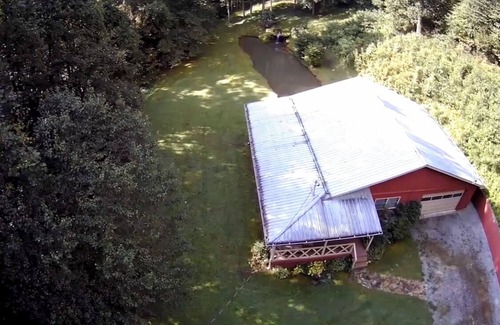Inside, there are two bedrooms and a fold out couch for sleeping up to 6 guests. There is a full bathroom and an open kitchen with ample counter space for those who want to cook their own meals. An open dining room allows for relaxing in front of the TV or playing games at the dining room table. There is a picnic table outside with a view of the man-made pond and waterfall. Just a short walk up the path and you arrive at the natural waterfall located on the property.