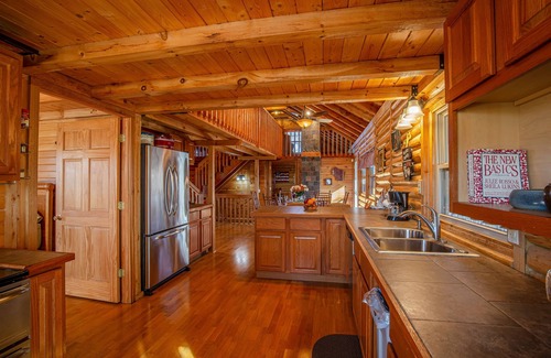 The 2600 square foot 3.5 bath log home sits on 40 acres. The home features four spacious bedrooms with plush beds, a large surround deck in the tree tops, high speed internet & access to private walking trails that wind through the woods complete with limestone cliffs and pollinator prairies. The interior of the home is lined with pine boards that give off a pleasant aroma and add to the character adding to the cabin feel but the home is well appointed and has all the features you will likely need.