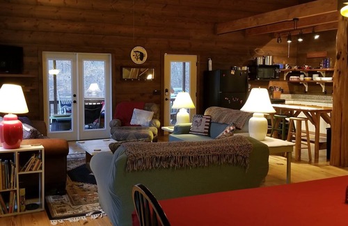 The cabin comfortably lives 18 family/friends. The outdoors is mostly wooded with a fabulous view and easy access to the lake! There is a small lawn with seating around a fire pit, and a spacious dock for reading, sunning, and splashing; the dock has a ladder allowing easy access for swimming.