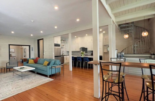 This very unique building was a home decor store in its previous life. The post and beam/farmhouse style building is now a vacation rental with the bottom two floors