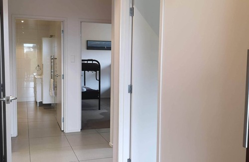 There are two double bedrooms (one upstairs, one downstairs) each with a queen sized bed, upstairs opens out to the back deck and spa pool. The third room (downstairs) has two single bunks, able to sleep 4 people. All rooms have large fitted cupboards and space to store clothing.