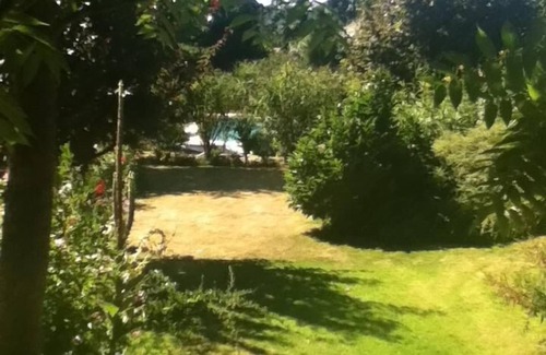 Oval swimming pool with deckchairs out of sight in a landscaped park shared with the owners.