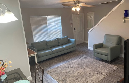 This completely remodeled town home with two bedrooms upstairs and 1 coach in the living room, i can add another single bed in the living room.