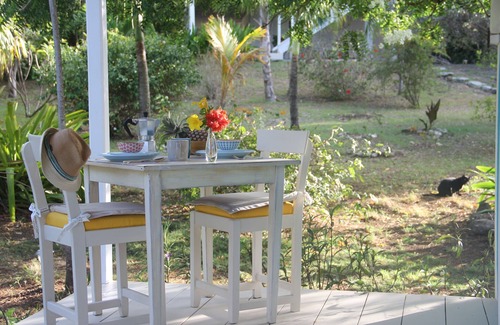 The cottage is designed to be open to the breeze throughout the day & night. Tradewinds blow though the windows (installed with white painted burglar bars, no glass or screens). The bathroom is tiled with Travertine tiles and has a waterfall tap into an Egyptian marble sink.