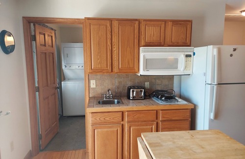 The bedroom has a comfortable queen bed, and the small office has a camping cot (not a futon, but cot wasn't an option). The bathroom includes a washer and dryer. There are tv's in the living room and bedroom with basic cable and streaming services. The apartment has wi-fi, but I find it isn't as strong as in a metropolitan area. The neighborhood is mostly quiet, but if you're really lucky, the ear-splitting siren will sound for the volunteer firemen, so you'll get the full small-town experience.