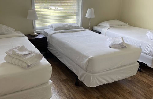 Our family cabins offer 3 bedrooms 2 bathrooms a full kitchen and living room combo with dinning table. Close to the lakes and guest services. Each cabin comes equipped with a back porch patio with bbq fire pit and private driveway.