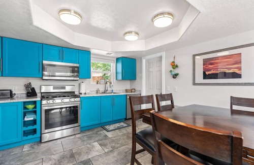 Fully equipped kitchen. The kitchen includes a full-sized refrigerator, dishwasher, stove, microwave, and a full suite of appliances perfect for making any type of meals throughout your stay! The home includes dishware, cookware, bakeware, a knife set, a Keurig coffeemaker, pans, a blender, silverware, and more. There is a wood dining table located in the kitchen with seating for 6 -- and mountain views!