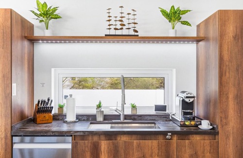 Step inside this modern villa and prepare to be wowed by its chic design, full air conditioning, and breathtaking views. The open-concept kitchen is a true chef's delight, boasting sleek cabinetry, high-end appliances, and a convenient island with leather stools. The banquet area is perfect for hosting dinner parties, with a wood-top table and seating for eight.