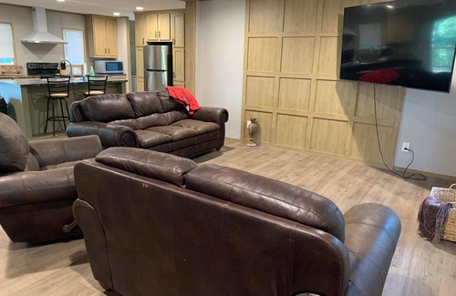 Fully equipped kitchen with fridge, oven & dishwasher. 2 large living areas with large flat screen tv’s throughout plus free wifi. Also equipped with a washer/dryer. Large covered back deck and covered front porch and deck