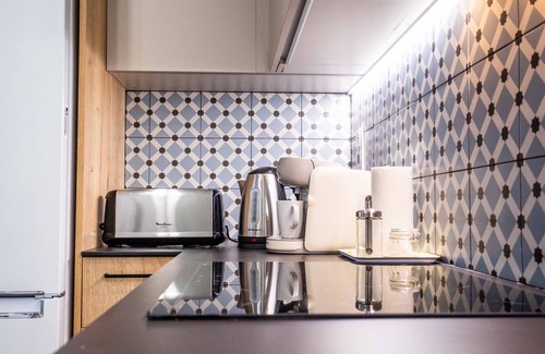 The kitchen is fully equipped with all the essential amenities you would need for a convenient and enjoyable stay including an electric stove, oven, refrigerator and freezer, electric kettle, coffee machine and dishwasher.