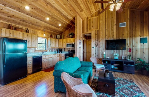 Discover the beauty and excitement of Blanco from this rustic rambler for six! Embracing its natural surroundings, this charming cabin has wood floors, walls, and ceilings well complemented by nice furnishings. You'll also enjoy Panoramic Hill Country views!