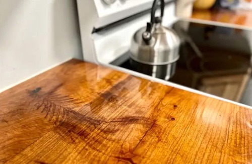 Cozy and rusticly appointed featuring pine board accent walls, exposed beam ceilings, live-edge wood slab countertops, and hardwood floors. Tankless hot water heater for hot water on demand. Plus, robust and dependable high-speed internet and WiFi for streaming.