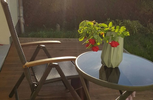 Both rooms are connected by a large double door and the large patio door allows the view into the garden. Here you have a view protected seating and barbecue area. You are also welcome to use the rest of the garden and look for a nice spot.