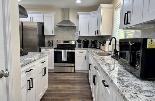The kitchen has 100% all-new cabinets, granite countertops, and appliances (including the washer/dryer) so you will love cooking your favorite meal! Or use our fully stocked kitchen to take the meal outside and enjoy the yard and bench seating as well. If you prefer to grill, there is a Weber charcoal grill. Also, make sure to check out the coffee station which features a Keurig and a traditional coffee pot.