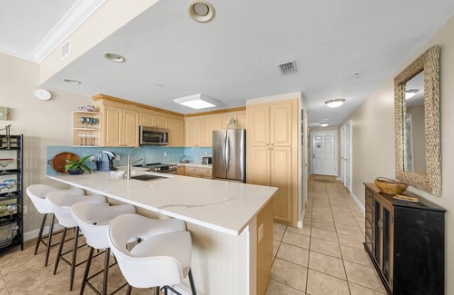 This fabulous unit has been updated and offers almost 1,200 square feet of beachfront living space. The fully equipped kitchen features quartz countertops and stainless-steel appliances and has everything you need to prepare meals for family & friends. The living room offers ample, comfortable seating with expansive views of the gulf, a television, and access to the unit's private balcony. The gulf front master bedroom offers a King-sized bed and has its own private ensuite bathroom featuring double sinks, a walk-in shower, a large soaking tub, and spacious walk-in closet. The second bedroom has a Queen-sized bed. There is an additional full bathroom with tub/shower combo. The living room sofa pulls out into a Queen size bed, allowing the unit to comfortably sleep 6. For your convenience, the unit also has a washing machine and dryer for your use.