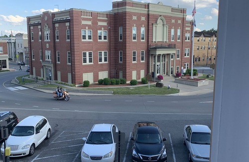 The NEW "Bourbon on the Square" Loft welcomes you with an historic entry staircase into a relaxing loft right off the revived downtown square. There is a quaint coffee shop below, an upscale pizza joint, a tavern, brewery, wine and bistro, restaurants, and many local shops within walking distance.