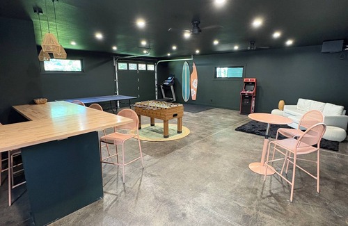 Enjoy two king suites, a wild bunk room with loft, large open kitchen/living room (sofa sleeper) and a separate indoor moody arcade bar/lounge with fitness area.