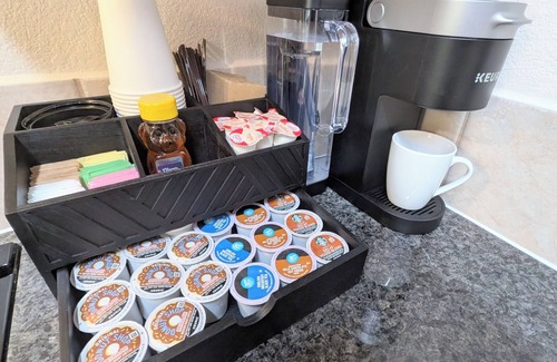 The fully equipped kitchen includes cookware, dishware (including kid-friendly options), basic spices, and appliances like a k cup coffee maker, toaster, blender, and more. Whether you're prepping quick breakfasts or full family dinners, everything you need is right here.