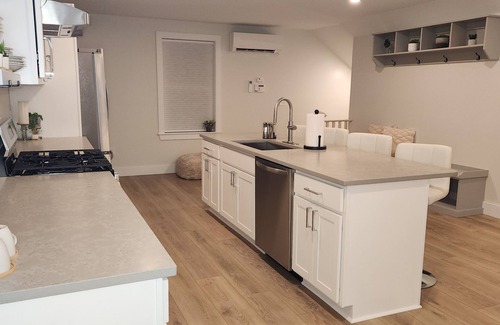 This brand-new walk-up Winthrop apartment overlooking Maranacook Lake boasts European furniture and sleek finishings throughout. You'll find 2 inviting bedrooms with hotel quality king and queen beds. Guests enjoy amenities like 85-inch TV equipped with Bowers & Wilkins stereo system and streaming of your favorite apps; WiFi included. Full size washer & dryer, AC, dishwasher and coffee bar make this your home away from home. This rental is directly adjacent to The Silver Oaks wedding venue, Winthrop's premier wedding spot featuring beautiful green space, an indoor & outdoor bar, and firepit blending rustic with glam aesthetic. Convenience is unmatched for event-going at this luxury wedding retreat where you can easily walk to your event without having to worry about parking and transportation. Plenty of parking for at least 6 vehicles with overflow capacity for an additional charge. Favorite local spots include restaurants White Duck Brew Pub and Weathervane Restaurant & Lounge for lakeside dining and live music and Fast Eddies for a retro treat. Norcross Point local park and boat launch is just 1 mile from our location; a perfect place to launch your boat or kayak or catch some tunes at the park's summertime concert series.