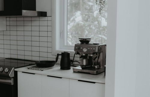 Set in a forest inside the village of Mansonville (Eastern Townships), 1h30 from Montreal, Chalet Creme is a brand new modern chalet with a bright design and amazing views of natural splendour through the large glass windows. Enjoy a meditative sauna experience, snuggle up with a loved one in front of the fireplace or even make yourself a delicious coffee in our fully-equipped & refined kitchen, this space is meant for making memories to carry for a lifetime.