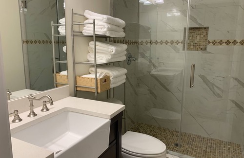Apartment is brand new and immaculate, and feels like a high end hotel yet with the comforts of home. Beautiful hardwood floors throughout with open floor plan. Enjoy the lovely kitchen with granite counters and stainless steel appliances. Sip coffee and/or cook a meal – kitchen is yours to command. It’s open to living room area with large screen TV. Couch folds out to sleep 1.