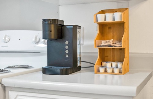 While there are some great dining options in town, our kitchen is fully stocked with all the essentials you'll need to cook you and your loved ones a nice meal. Fully equipped with a dishwasher, brand new refrigerator/freezer, microwave, stove, oven, toaster, Keurig coffee maker with full coffee bar, dishes/silverware, cooking utensils, and pots/pans. The adjacent dining area has seating for four guests.