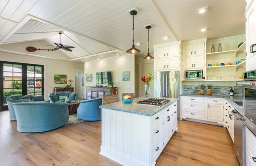 The home offers two master suites with large walk-in showers, plush king beds, ample closets, smart TVs and access to the double outdoor shower. Step out through the indoor shower to the outdoor shower to shower under the star filled Hawaiian sky. Come spend time on the spacious covered lanai, which opens up to the indoor spaces through a folding glass wall that allows the indoor and outdoor spaces to truly become one. Eat at the outdoor dining table and relax in the cool trade winds while catching a glimpse of our beautiful Hawaiian waters or watching the widescreen TV in the living room. The cottage’s gourmet kitchen is equipped with a gas range, Kitchen Aid appliances, granite countertops, open shelving and a Keurig for your favorite hot drinks. Enjoy the convenience of a full laundry, which includes a large capacity washer and dryer and a deep laundry room sink with ample countertop space.
