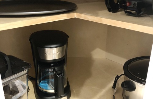 Kitchen amenities: Toaster, coffee maker, Keurig, crock pot, glass baking dishes and pans, electric skillet, griddle, pots and pans, muffin and pizza pans, electric hand mixer, ninja blender, and more.
