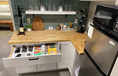 The kitchenette is stocked with countertop double cast iron burner, toaster oven, coffee maker, tea kettle, microwave, full sized refrigerator and filtered water dispenser. Coffee cups and wine glasses on open shelves with dinner and flatware housed in the cabinetry below. Cookware, cutting boards and utensils provided. Please note there isn't a sink in the kitchenette but guests have full access to the shared laundry room with deep basin sink.